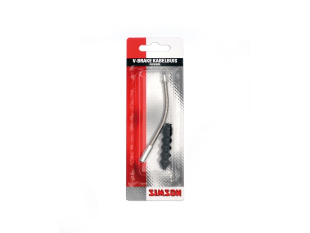 De Simson Remkabelbuis V-Brake met een flexibele bocht voor een goede aansluiting tussen de remkabel en het V-brake remsysteem. Hierdoor wordt de remkracht correct overgebracht op het V-Brake remsysteem. Sluit de buitenkabel aan op de remkabelbuis. Trek de binnenkabel van de rem door de remkabelbuis en sluit de binnenkabel aan op het V-brake remsysteem met een inbussleutel. De Simson remkabelbuis wordt geleverd inclusief stofrubber.